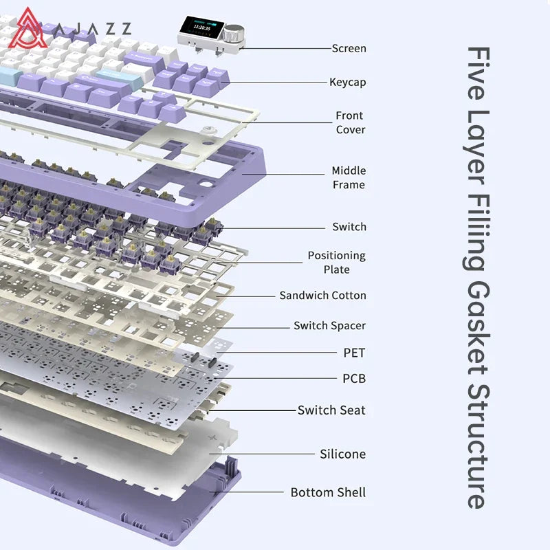 3、Five Layer Filiing Gasket Structure:Non-preloading structural design with five layers of sound-absorbing materialsadded to effectively mitigate keyboard cavity noise, resulting in cleaner sound