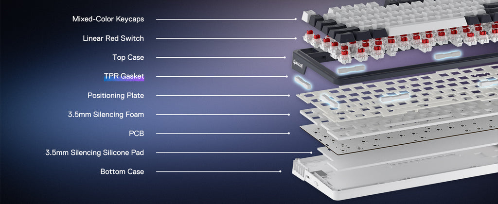 REDRAGON GASKET OUT - The body structure differs from traditional screw fixing by using precision-locked covers with gaskets to assist with noise reduction and flexibility. It provides even feedback while the vertical cushioning reduces rigid noise, delivering a crisp, clean and softer typing feel.