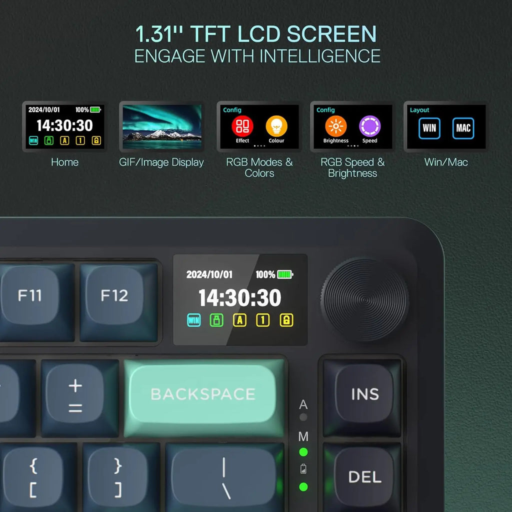 • Smart Info-Island Screen - 1.41 in info center TFT screen, gathering keyboard info, connection mode, battery level, typing status, unveiling everything you want to know, enjoy gif meme customized fun for the present mood