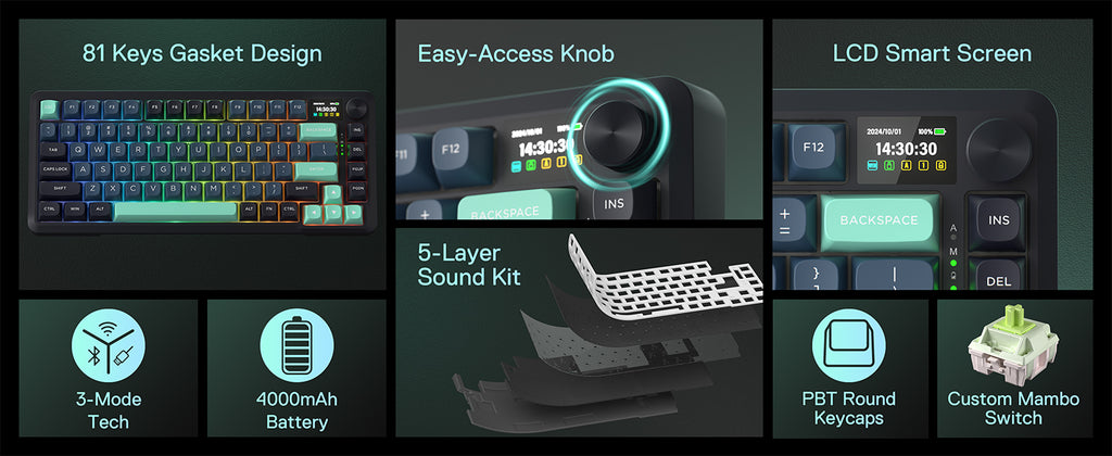 • Custom Mint Mambo Switch - With thick-lubed custom linear switches combo with a gasket form factor, K724 PRO features cushioned rich linear travel with silky creamy and cozy typing feedback. The brand new upgraded socket is nearly all switches(3/5 pins) compatible