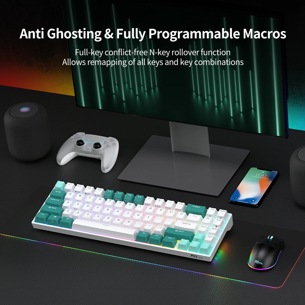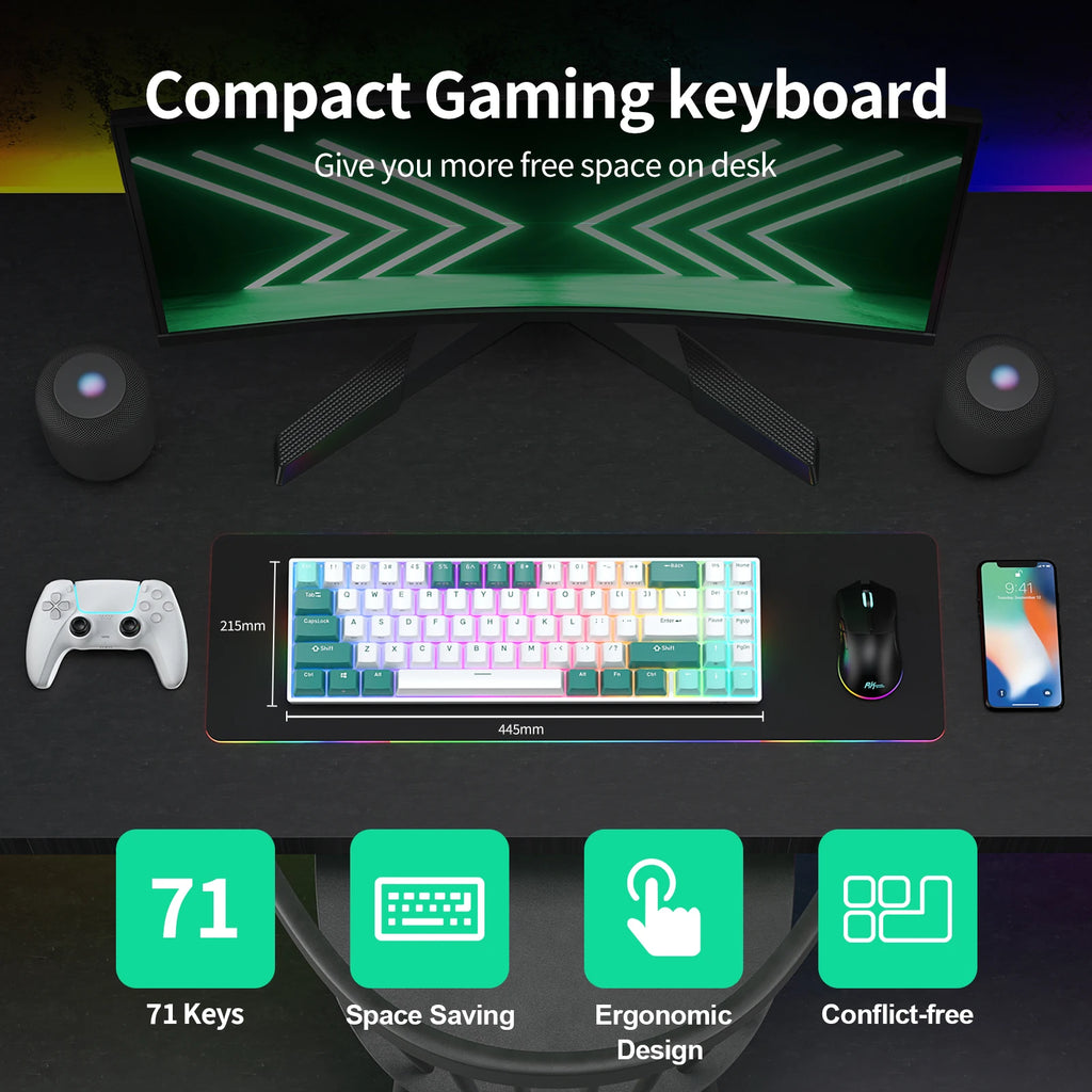 1.Mini 70% 71 Key Keyboard - RK71 mini 70% gaming keyboard is a ultra-compact layout with 71 keys makes you a neat desktop with your organized gears on, even folks have nothing to do with Minimalist will dive into its tiny practical design. Tips you might want to know is that keyboard without numpad is most FPS gamers' choice, more spaces left for mouse movements.