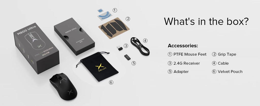 Accessories: ①PTFE Mouse Feet ②Grip Tape ③2.4G Dongle ④Braided Cable ⑤Adapter ⑥Velvet Pouch