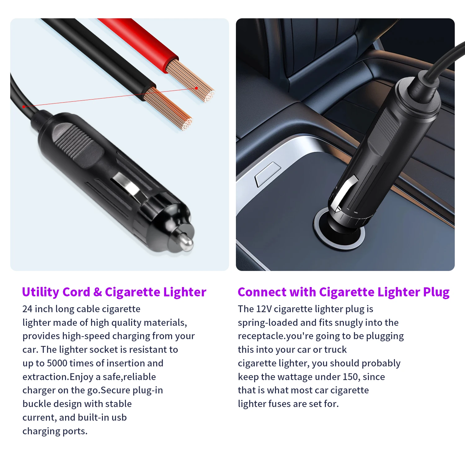 Comes with one 110V AC outlet and two USB ports, can provides enough power for your smart phone, tablet, laptop, digital camera, fan, game console, DVD/Blu-Ray player, GPS, lamps, and more under 150W.
