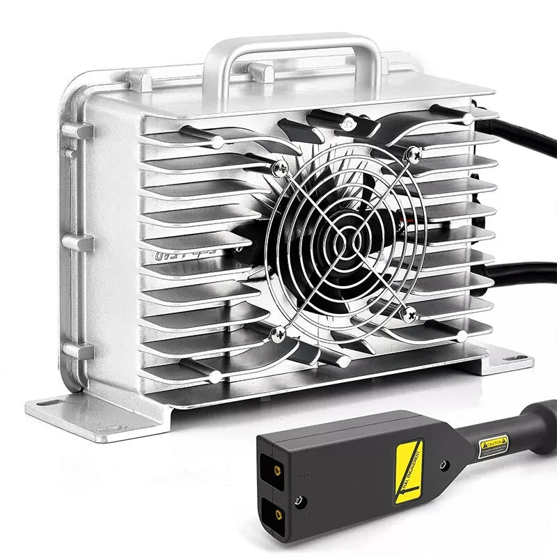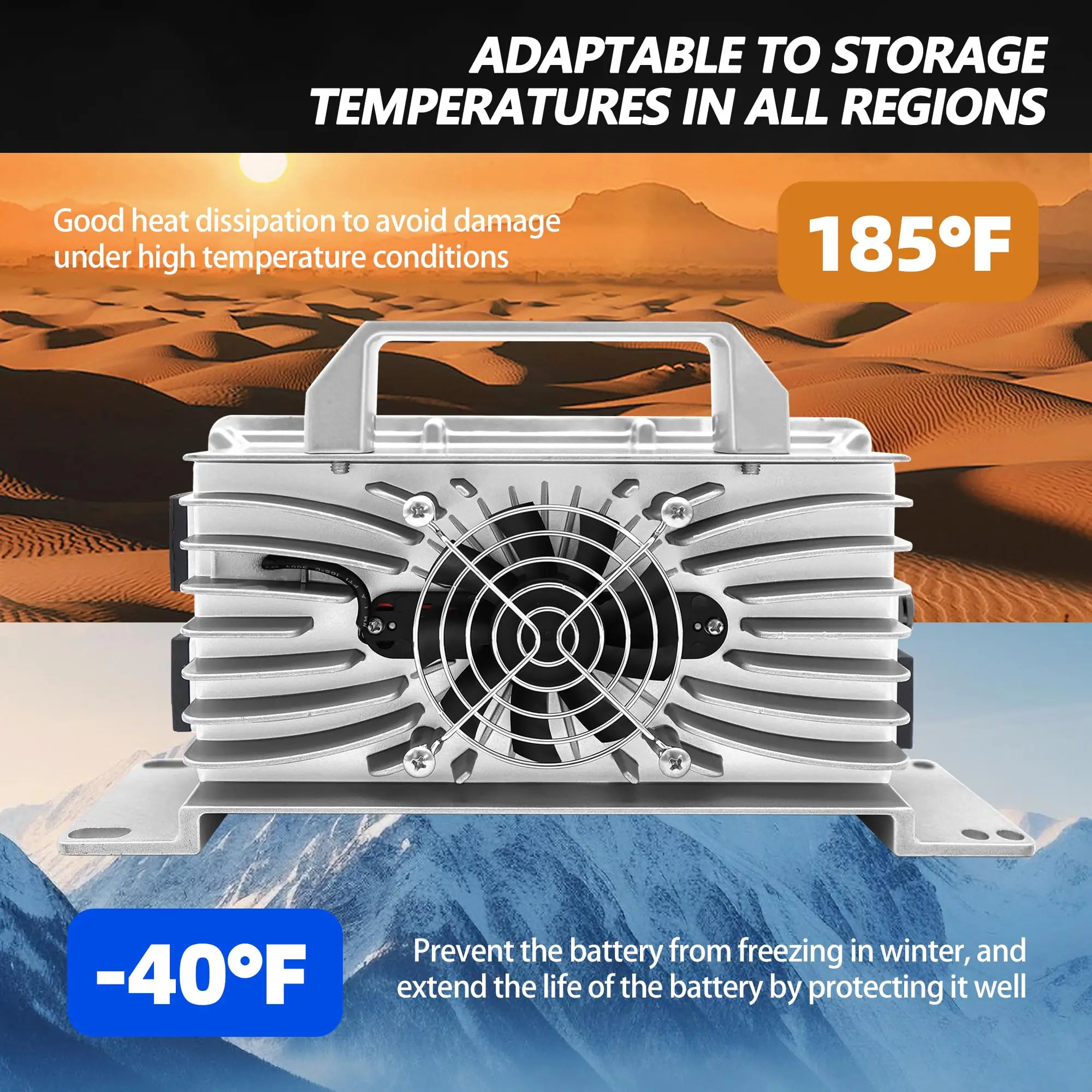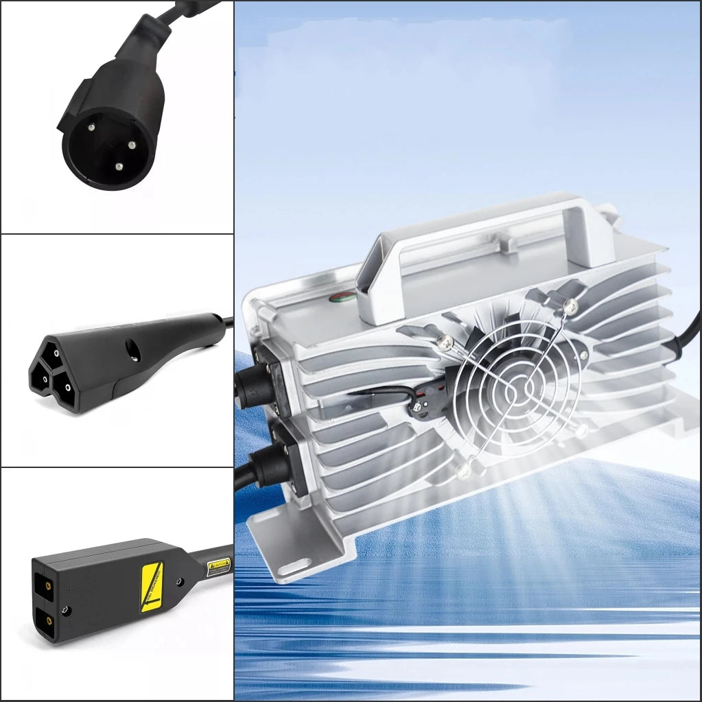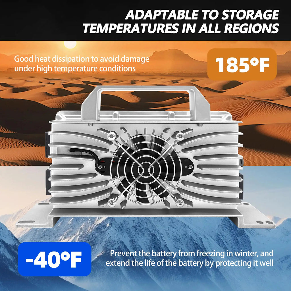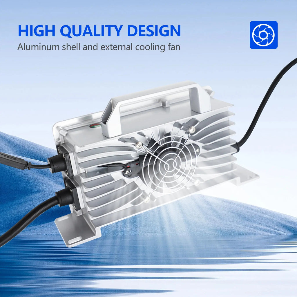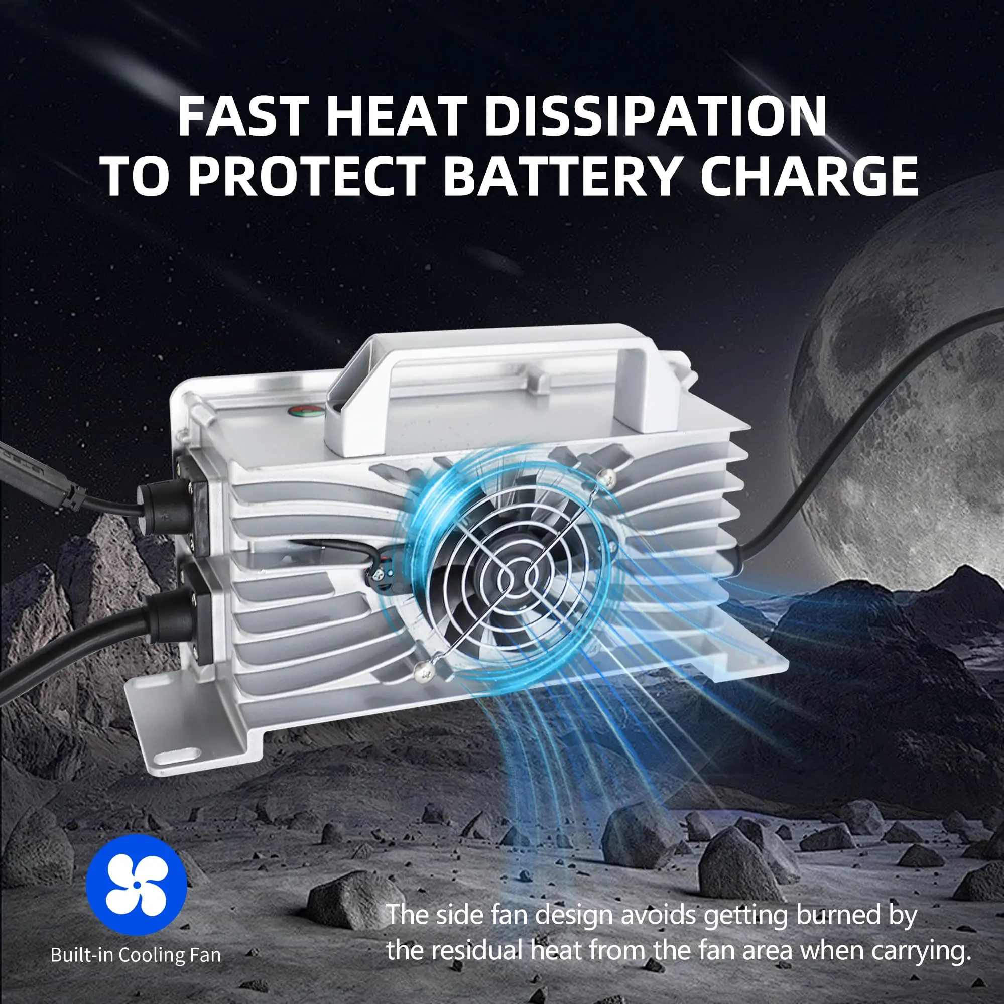 Aluminum alloy shell and external cooling fan allow the golf cart charger to dissipate heat quickly, making it safe to charge. The cooling fan is located on the side to prevent hand burns from residual heat in the cooling area when handheld.