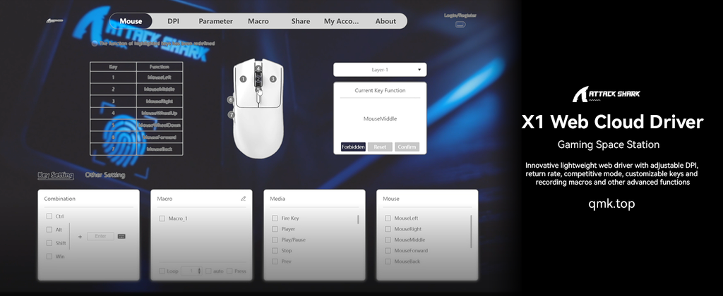 The X1 mouse has dual drivers: Web Driver (https://qmk.top/) and ATTACK SHARK self-developed driver (DRIVER DOWNLOAD: https://attackshark.com/pages/dirver-download). Configure your mouse in driver to program buttons, DPI settings, polling rate, marco, LOD and other advanced functions. You can seamlessly manage multiple devices and easily adjust mouse settings.