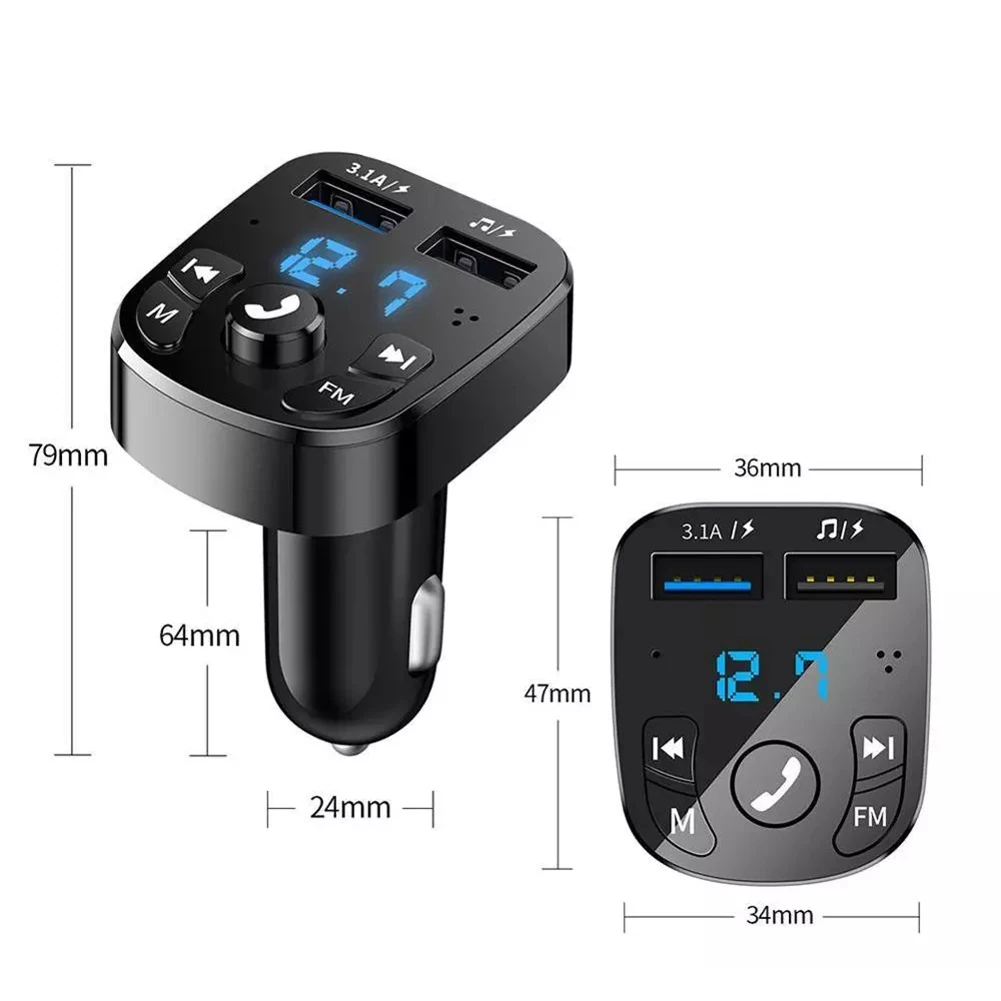 Feature: Specification: Material: ABS Colour: Black Working voltage: 12V-24V Input current: 3.1A Display: digital display Transmission frequency: 87.5-108MHZ Effective distance: about 10m Bluetooth-compatible version: 5.0 Support expansion: U disk≤32G Launch distance: <5m Size: 75x52x52mm/2.95x2.05x2.05inch Weight: 35 grams Note: Due to the different monitor and light effect, the actual color of the item might be slightly different from the color showed on the pictures. Thank you! Please allow 1-2cm measuring deviation due to manual measurement. ![]()
