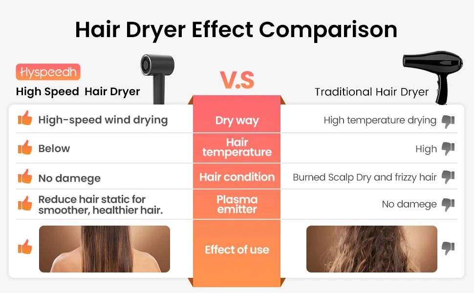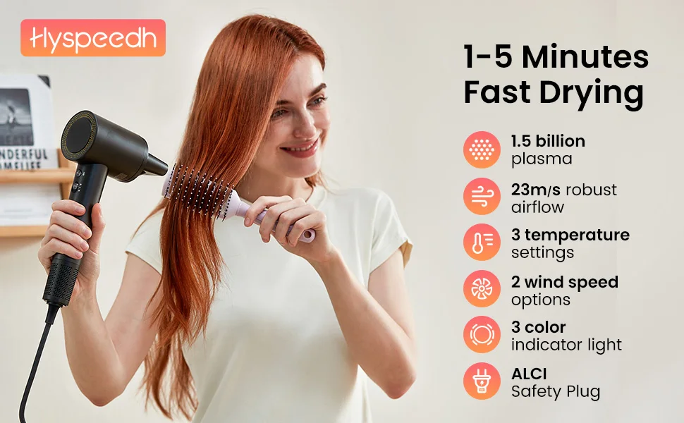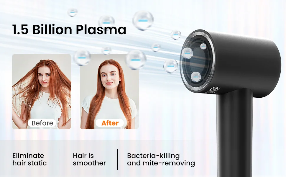 2. Upgrade Built-in Plasma Emitter - The ionic hair dryer generates 1.5 billion plasma particles while drying, releasing positive and negative ions simultaneously. These ions neutralize the static electricity in the hair, smooth the hair scales, and seal in moisture. Make your scalp healthier and truly care for it from the root.