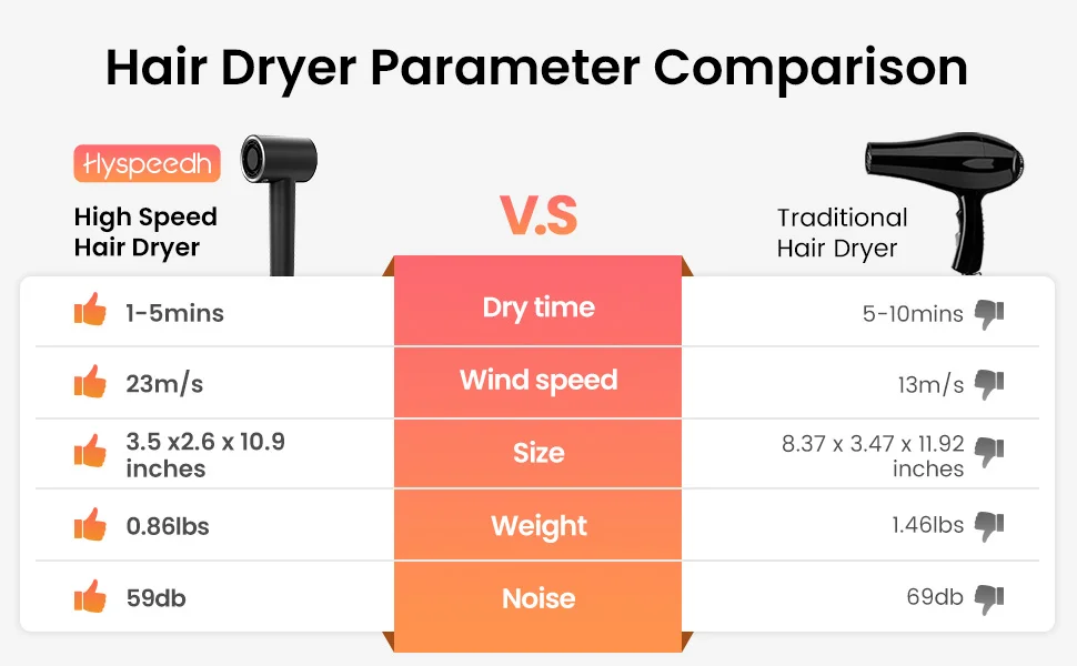 1. High-Speed Brushless Motor & Fast Drying - This travel hair dryer features a self-developed, unique 110K RPM high-speed brushless motor. The robust airflow can quickly dry hair Instead of old style high temperature drying which damage hair, completing the process 5 times faster than traditional hair dryers. Typically, it takes 2-5 minutes to blow dry hair, varying based on hair length and thickness.