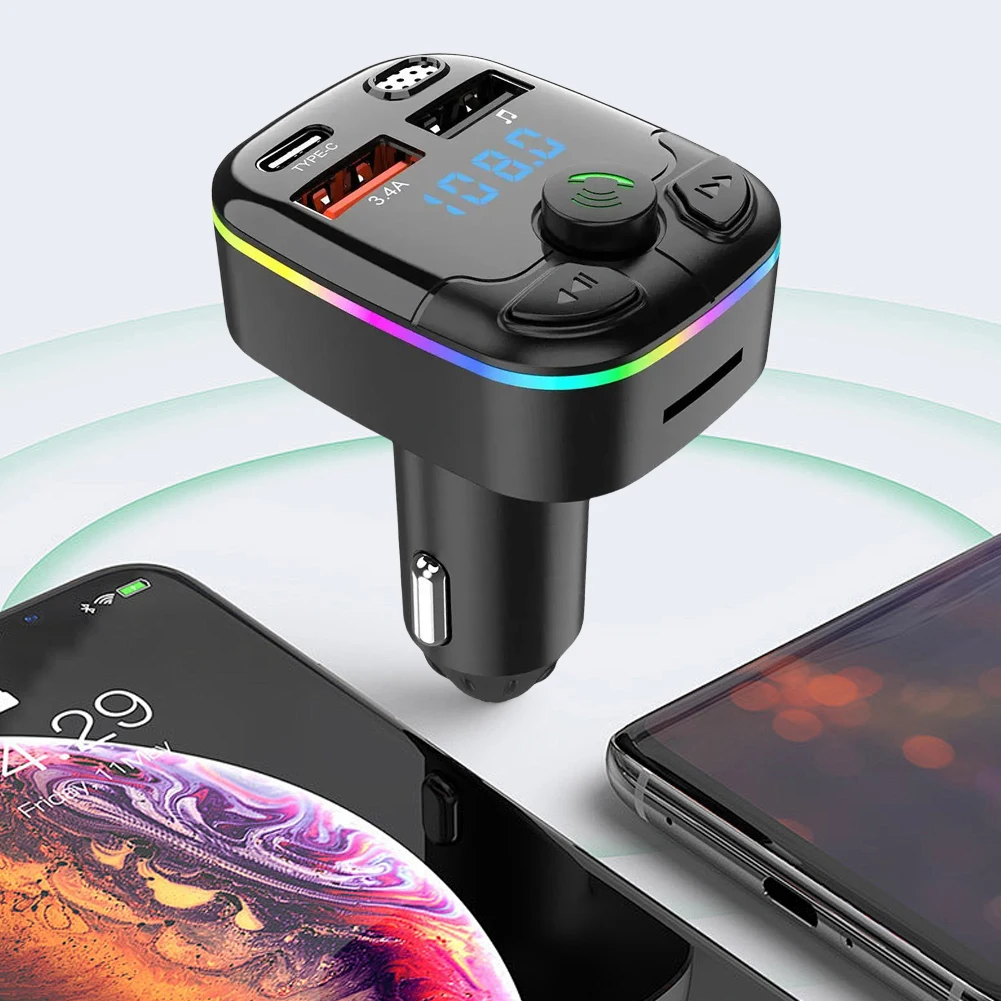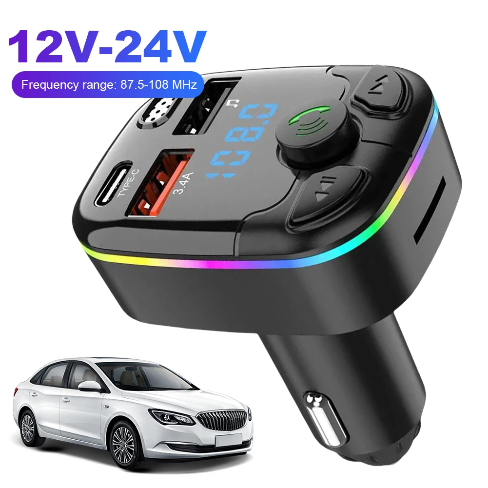 ![]() Car Music Adapter BT 5.0 Dual USB 3.4A Car Quick Charger Colorful Ambient Light Hands-Free Wireless Car Kit Auto Radio Modulator