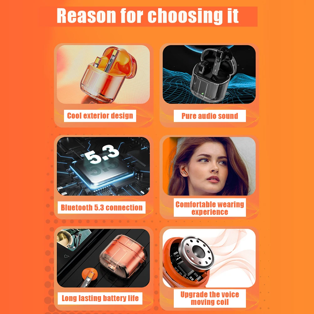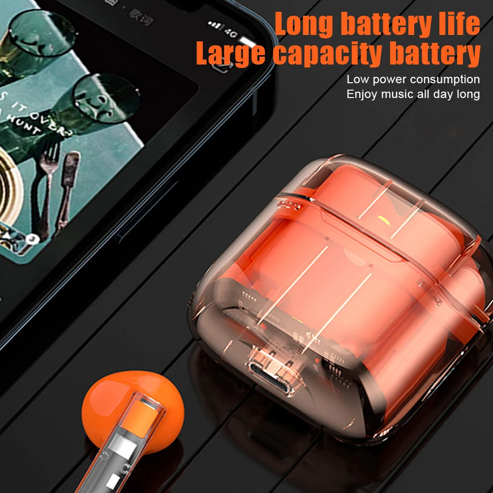 --The earphone and charging compartment are designed with translucent material, and the internal circuit system is clearly visible.